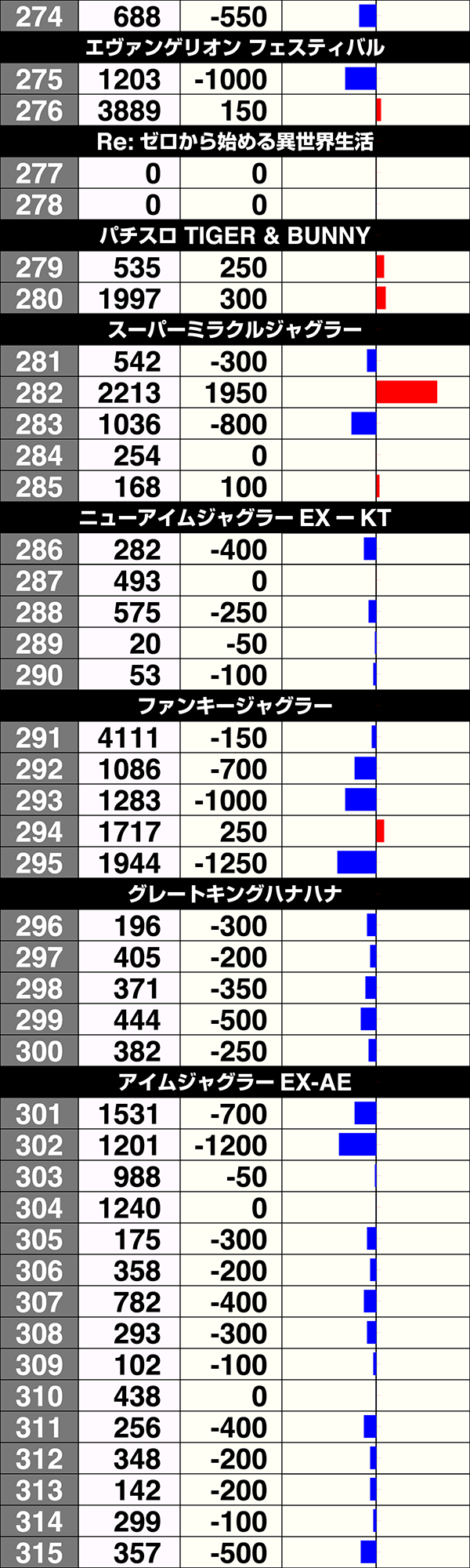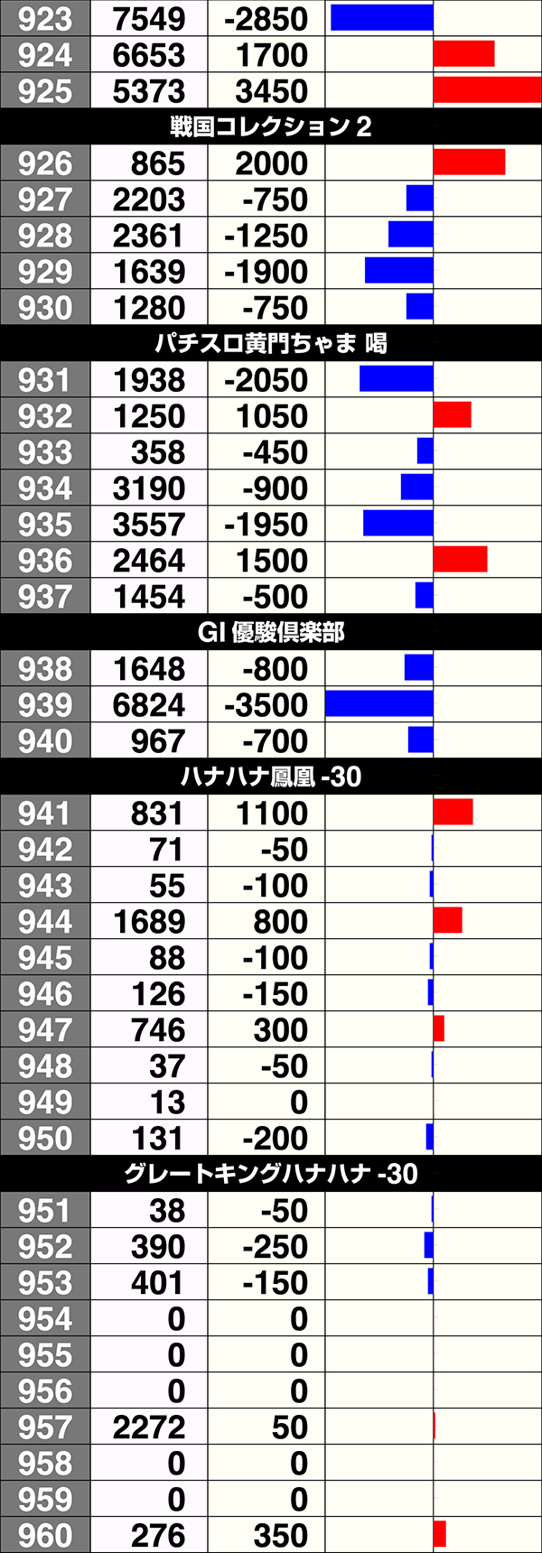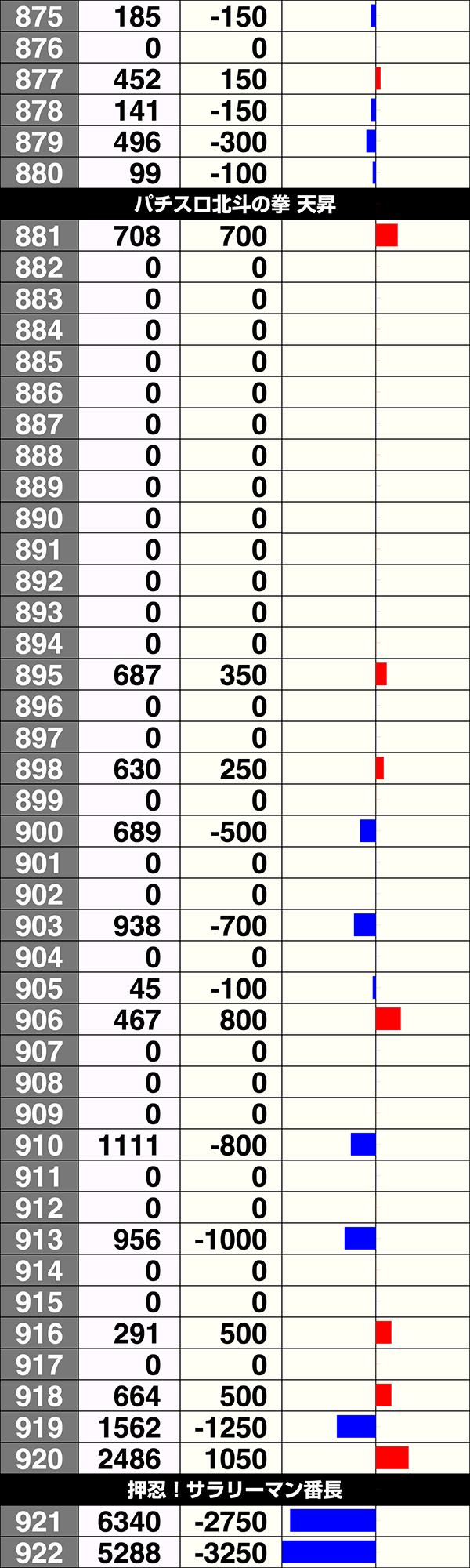 『押忍!サラリーマン番長』は5台中2台がプラスで、925番台はプラス3000ptオーバーであった。