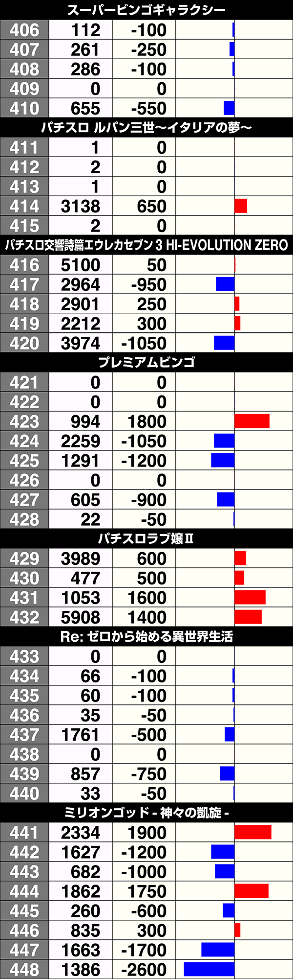 5台設置の『パチスロ黄門ちゃまV 女神盛-MEGAMORI-』と『パチスロ交響詩篇エウレカセブン3 HI-EVOLUTION ZERO』はともに3台がプラス。