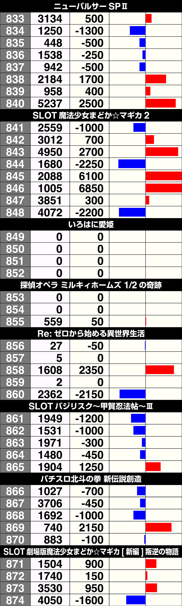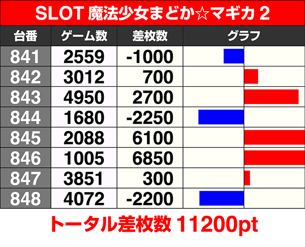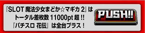 『SLOT魔法少女まどか☆マギカ2』は8台中5台がプラスで、845番台と846番台はプラス6000pt超。