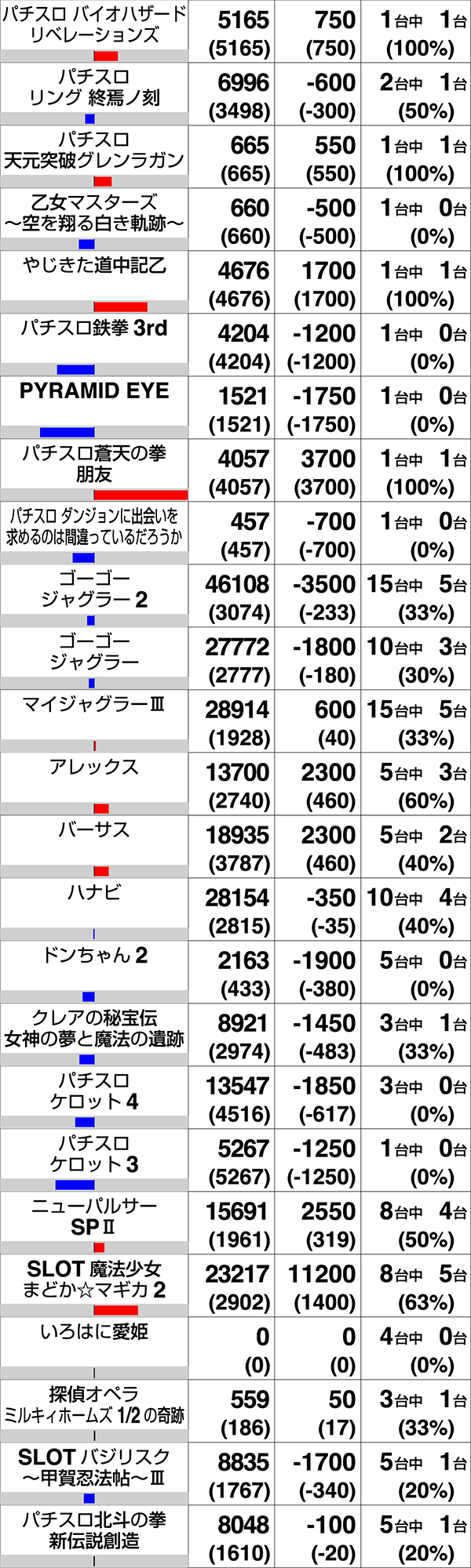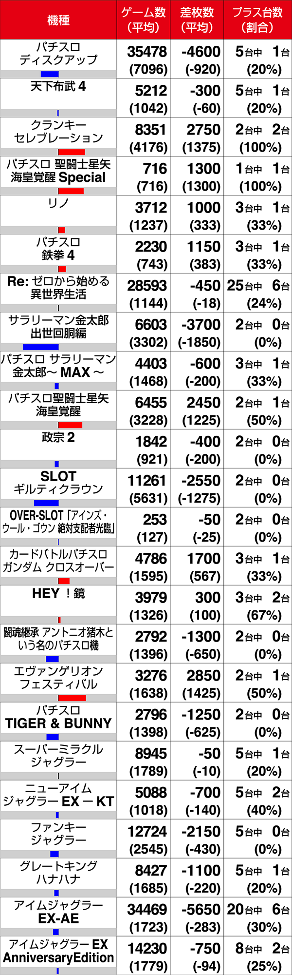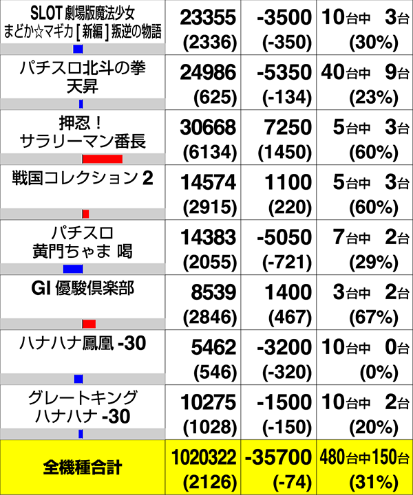 パチスロ全体で150台がプラス。2000pt以上のプラス差枚数を記録したのは33台であった。