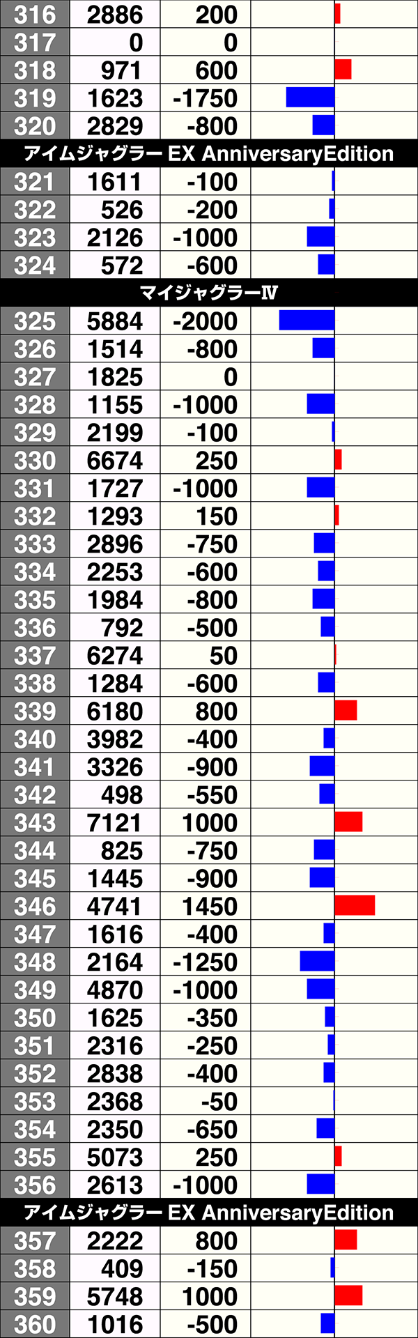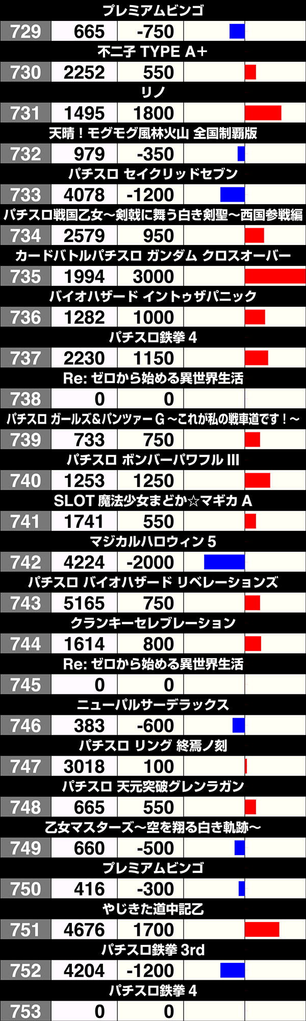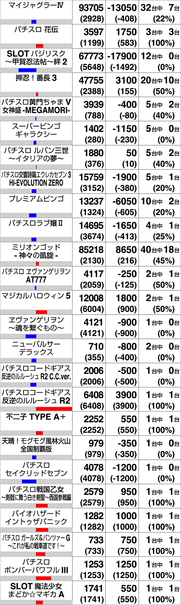 パチスロ全体で150台がプラス。2000pt以上のプラス差枚数を記録したのは33台であった。