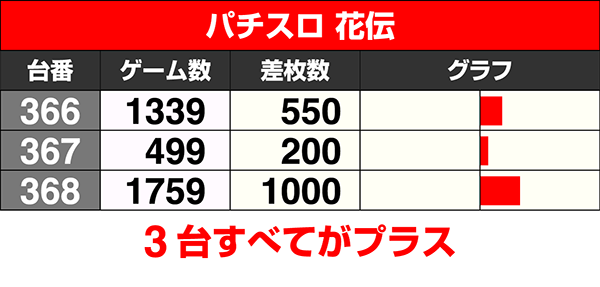 『パチスロ 花伝』は設置されている3台すべてがプラス。