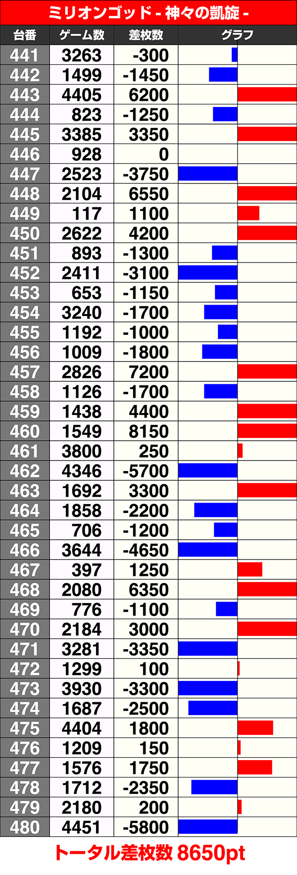 『ミリオンゴッド-神々の凱旋-』に5000ptを上回る台が5台あり、460番台がもっとも多い8150ptを記録した。
