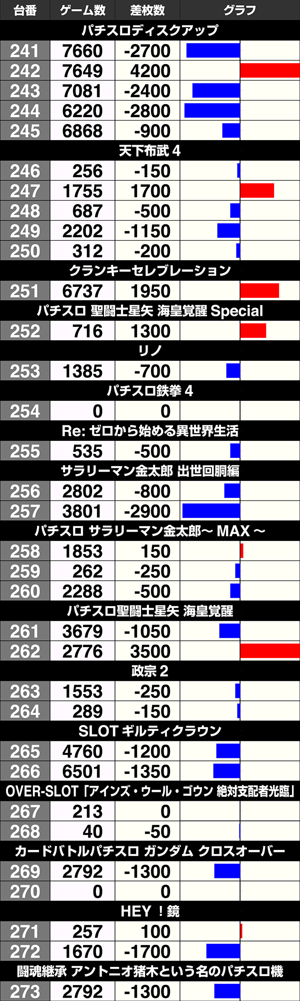 7000G以上楽しまれていた242番台の『パチスロディスクアップ』はプラス4200pt。
