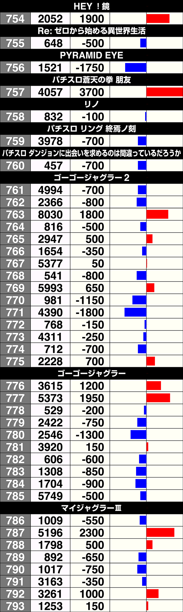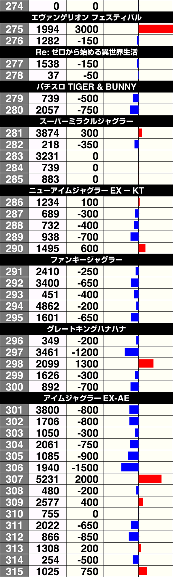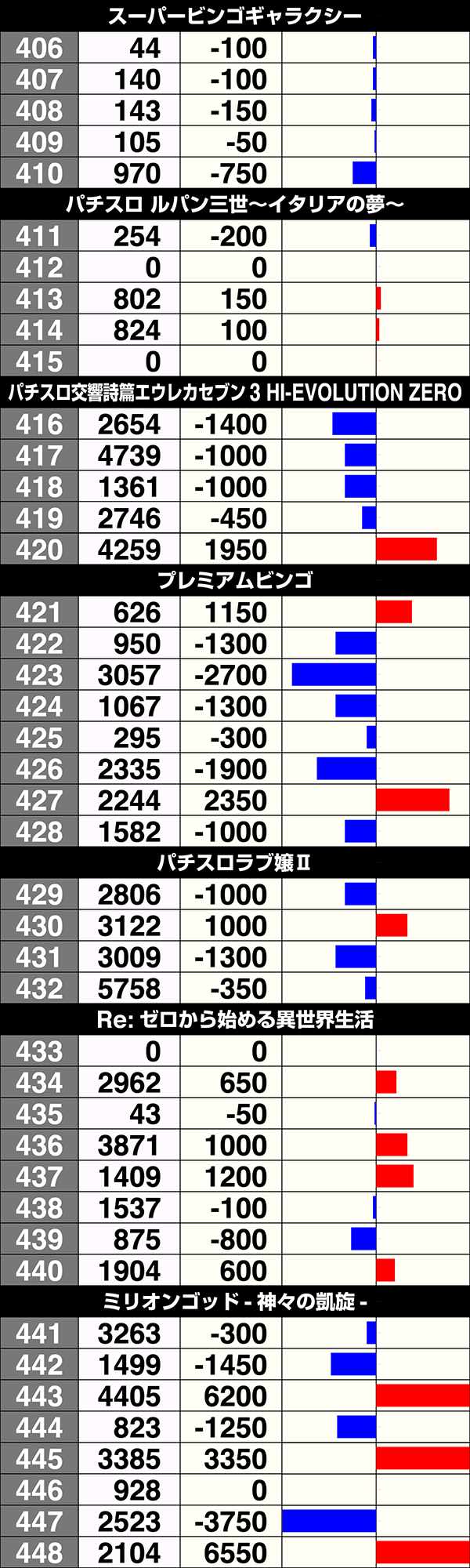 『パチスロ聖闘士星矢 海皇覚醒』と『エヴァンゲリオン フェスティバル』にも3000pt以上のプラス差枚数を記録する台があった。