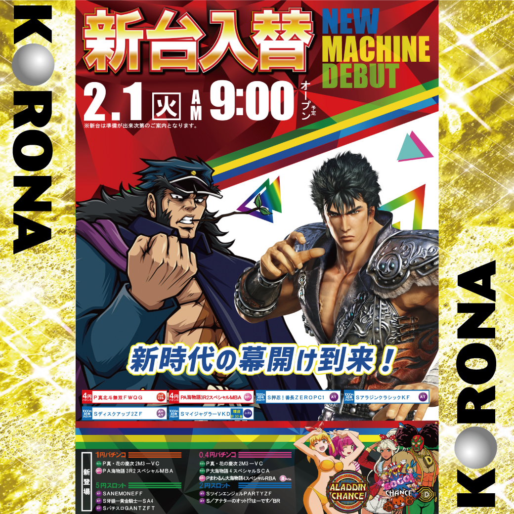 2月1日(火)『感謝』新台入替!朝9時開店!