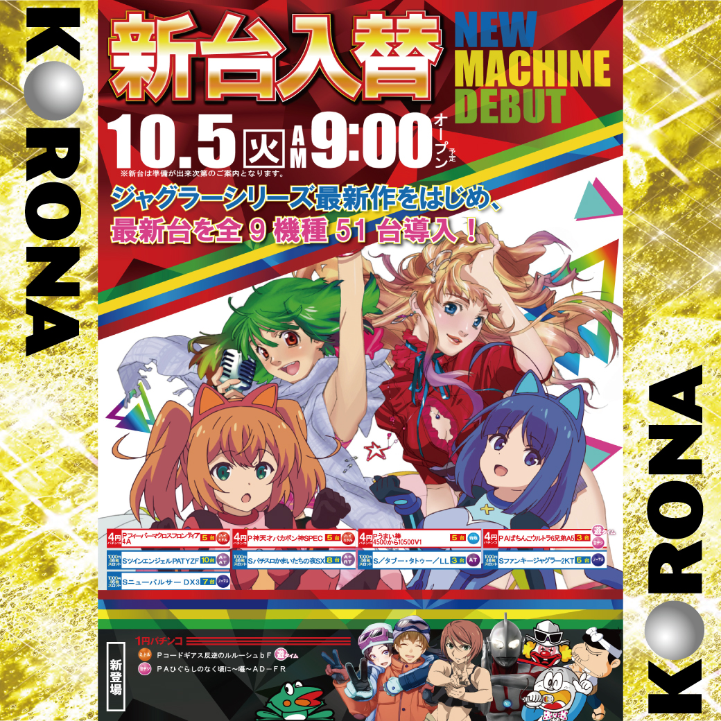 こんばんは小田原コロナです明日の営業のお知らせです明日10月2日(土)朝9:00開店(入場抽選8:30予定)週末店内入替人気機種増台完了!
