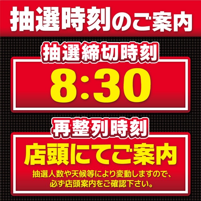 通常8:30迄にお集まりのお客様が対象となります。入場後一定時間離席・台移動禁止。詳細は店頭ポスターorスタッフにお尋ねください。 |
