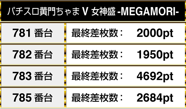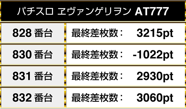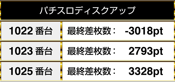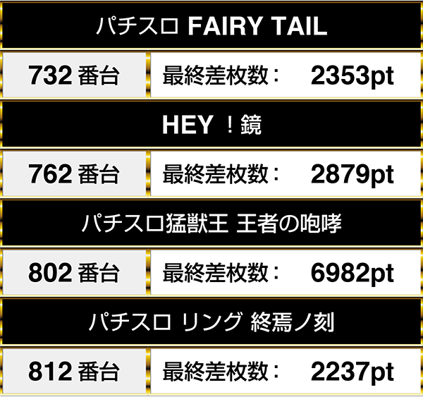 ほかにも、762番台の『HEY!鏡』や812番台の『パチスロ リング 終焉ノ刻』など、多くの機種がプラスptで終えていた。