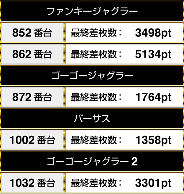 872番台の『ゴーゴージャグラー』や1002番台の『バーサス』、1032番台の『ゴーゴージャグラー2』などもプラスptとなった。