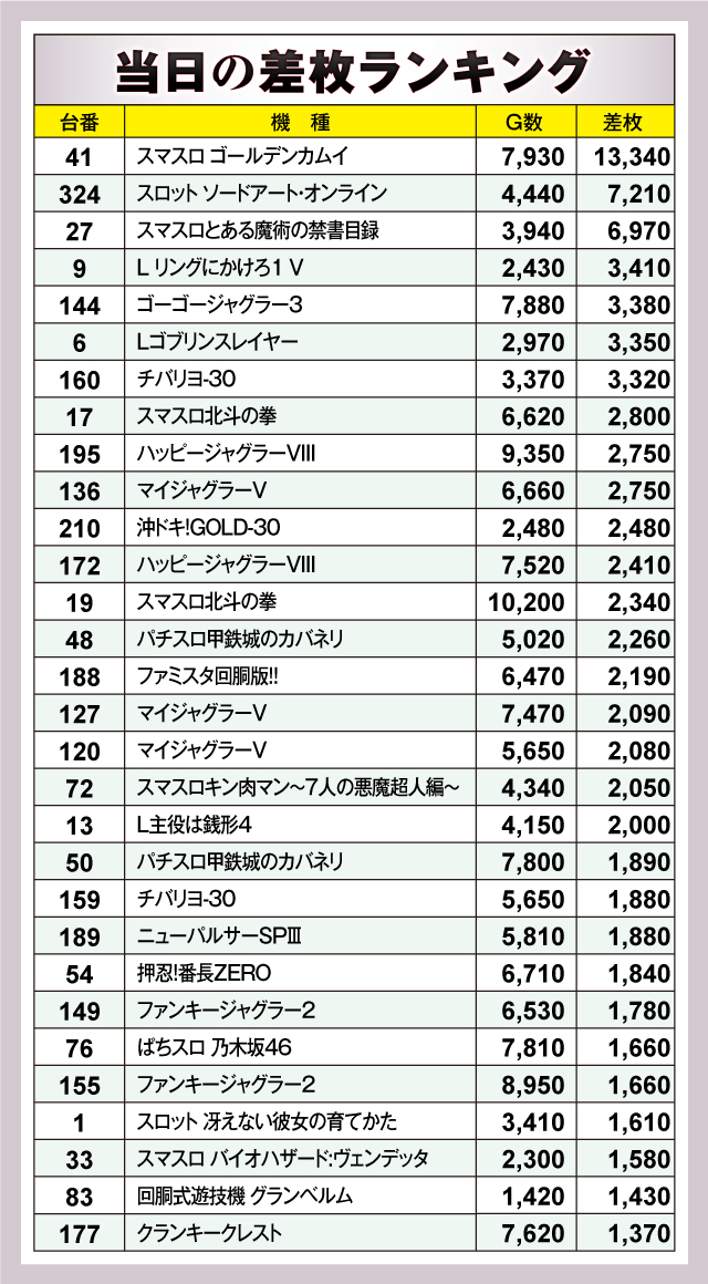 まずは当日の差枚ランキングを紹介していこう。30台のうち19台が差枚+2,000枚を超えており、+3,000枚超えは7台出現。それらのなかでもっとも優秀だったのは、41番台の「スマスロ ゴールデンカムイ」で、差枚+13,340枚を獲得! ランクイン機種を見渡すと、スマスロからジャグラーシリーズまで多種多様な機種がランクインしていたので、当日は幅広い機種にチャンスが隠されていた可能性が高そうだ!