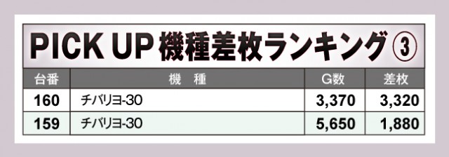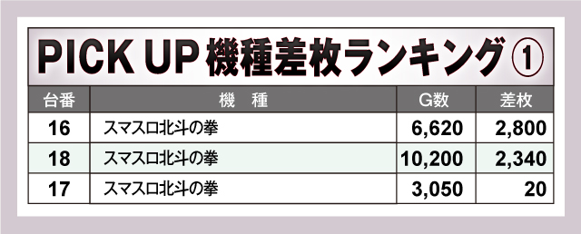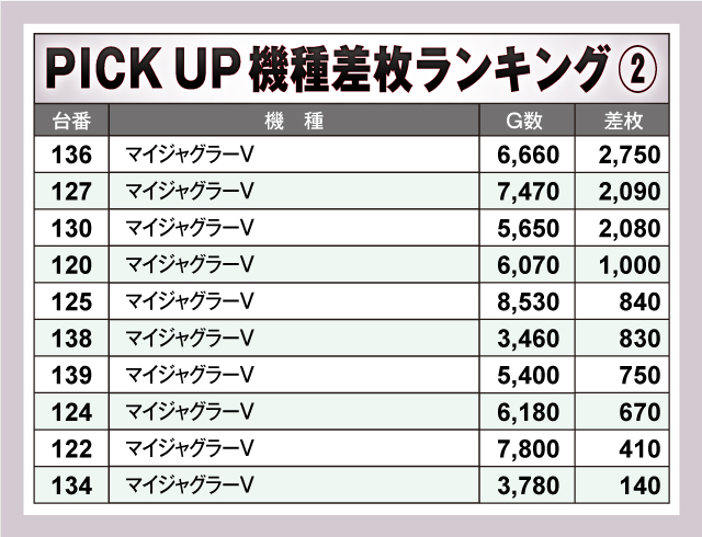 続いては、当日とくに店内を盛り上げた3機種を紹介していこう。3機種のピックアップすべてがトータルプラスの成績を残し、とくに「マイジャグラーV」はピックアップ10台のうち4台が差枚+1,000枚オーバー! 平均差枚も+1,156枚と申し分のない結果を残していた! その他の「スマスロ北斗の拳」「チバリヨ-30」の2機種も並びでしっかりプラス終了していたので、次回以降は並びに注目して立ち回ることをオススメするぞ!