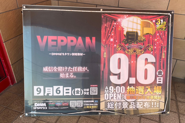 DMMぱちタウン取材班〝別班〟が威信を賭けて執り行う「VEPPAN」が、9月6日に「ドキわくランド橋本店」にて実施された。取材当日は朝イチから28人のファンたちが集まり開店時から大盛況! 取材時も多くのファンたちで活気に溢れていた。果たしてどれほどの盛り上がりを見せていたのか、ここからはスロット全226台の詳細とともに、当日の店内の盛り上がりをチェックしていこう!