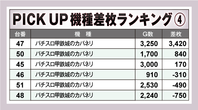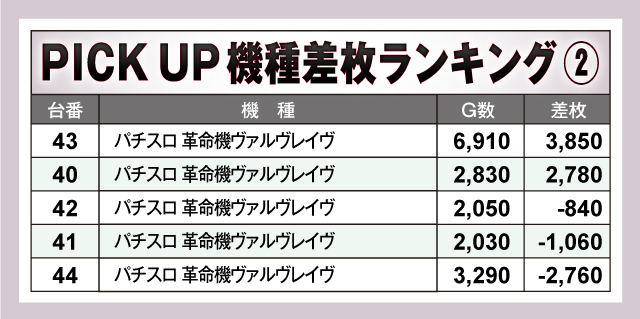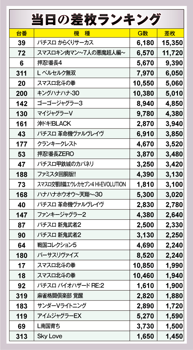 まずは差枚ランキングのチェックから。30台のうち22台が差枚+2,000枚オーバーで、+3,000枚オーバーは16台出現。それらのなかでもっとも優秀だったのは、39番台の「パチスロ からくりサーカス」で、差枚は大台突破の+15,350枚の超結果をマーク! その他ランクイン機種をチェックしてみると、人気スマスロ機種を筆頭に幅広い機種がランクイン。訪れたファンたちが存分に楽しめる環境が整っていたようだ!