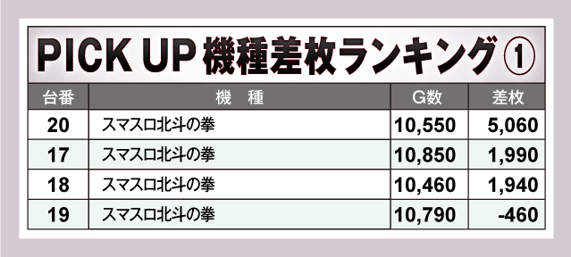 続いては、当日とくに盛り上がっていた4機種を紹介。4機種すべてがトータルプラスを達成しており、とくに「スマスロ北斗の拳」は、ピックアップ4台のうち3台が4ケタプラス終了と素晴らしい結果を確認! その他3機種からも良台が多数確認することができた。これらの機種たちの盛り上がりを見れば、当日どれだけ賑わっていたかが分かってもらえたハズだ!