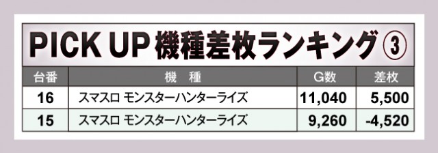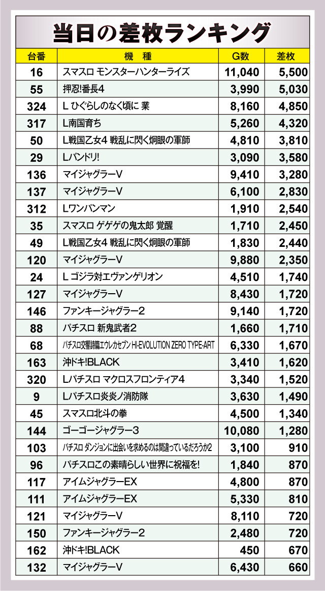 まずは当日の差枚ランキングを紹介していこう。30台のうち20台が差枚+1,000枚オーバーで、+2,000枚オーバーは12台出現。それらのなかでもっとも優秀だった台は、16番台の「スマスロ モンスターハンターライズ」で、差枚は+5,500枚を獲得! その他ランクイン機種には、スマスロが大半を占めるなか、ジャグラーシリーズが多数ランクイン。楽しめる環境は店内のアチコチにあったようだ!