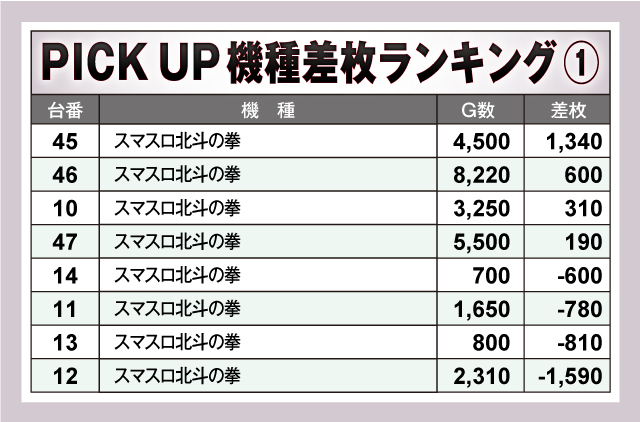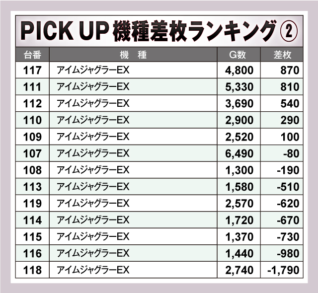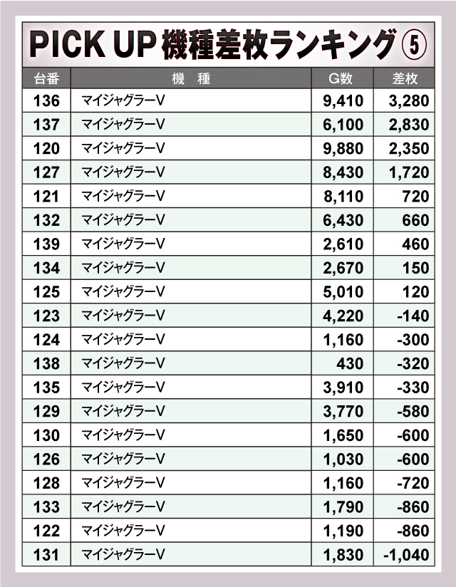 続いては、当日店内を大いに盛り上げた5機種をチェック。5機種全てから良台が出現していたが、とくに注目して欲しいのは「マイジャグラーV」の盛り上がり。ピックアップ20台のうち9台がプラス終了で、そのうち4台が差枚+1,000枚超えと上々の結果をマーク! その他の機種も活躍しており、もちろんこれら5機種以外からも良台はアチコチに出現していた!