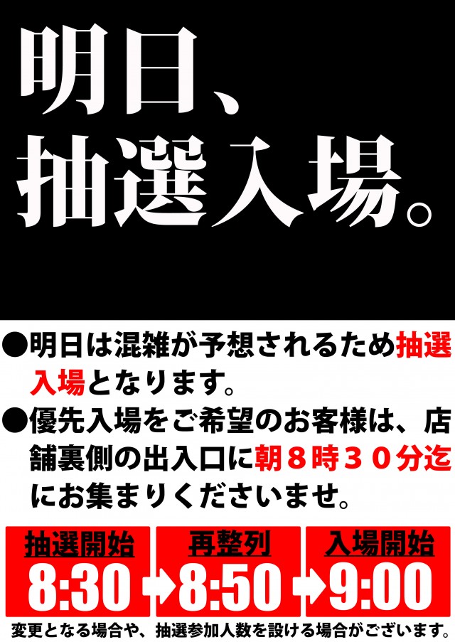 【明日抽選入場】9時開店!全国ファン感謝デー