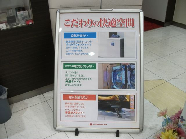 充実したレストコーナーだけでなく、ホール内の様々な場所にある空気清浄機や分煙ボードの設置、パチンココーナーの手置きスタンドなど「こだわりの快適空間」と書かれた看板に偽りのない環境が「一番舘相模原店」にはあった。それに加えて、気持ちのよいホールスタッフの接客がパチンコ・パチスロコーナーの魅力をより高く引き上げていたのではないだろうか。