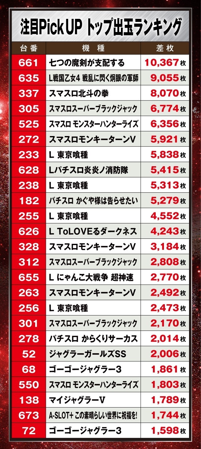 また、その他の機種では『スマスロスーパーブラックジャック』から+6,774枚、『L 東京喰種』から+5,000枚超が2台に+4,552枚など、導入間もない新台の活躍も目立っていたのが印象的であった。