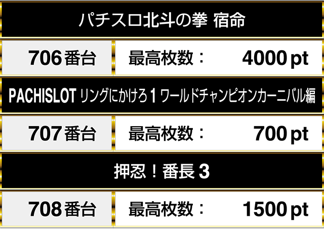 707番台の『PACHISLOT リングにかけろ1 ワールドチャンピオンカーニバル編』と『押忍!番長3』の708番台をあわせると、3機種を通してプラスptが並んだ。