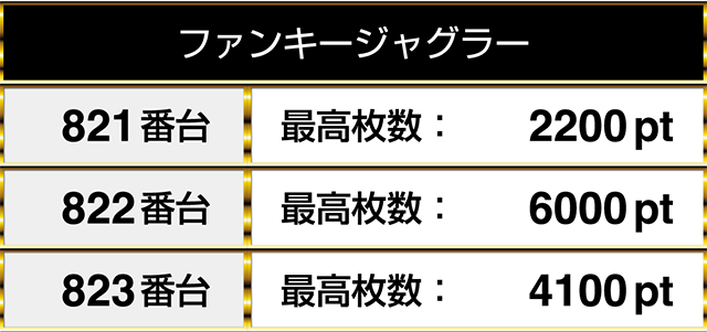 『ファンキージャグラー』には2000pt以上の台が並び、そのうちの1台は6000pt!