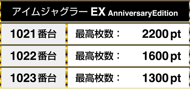 『アイムジャグラーEX AnniversaryEdition』には2200pt、1600pt、1300ptが並んだ。