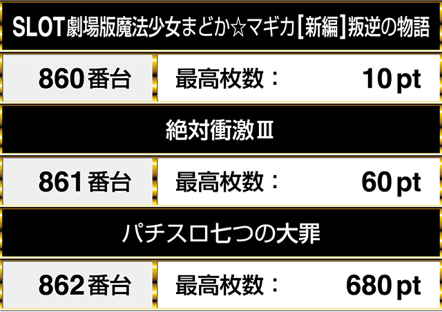 バラエティコーナーでは、『SLOT劇場版魔法少女まどか☆マギカ[新編]叛逆の物語』の860番台から862番台の『パチスロ七つの大罪』までの3台が連なってプラスpt!
