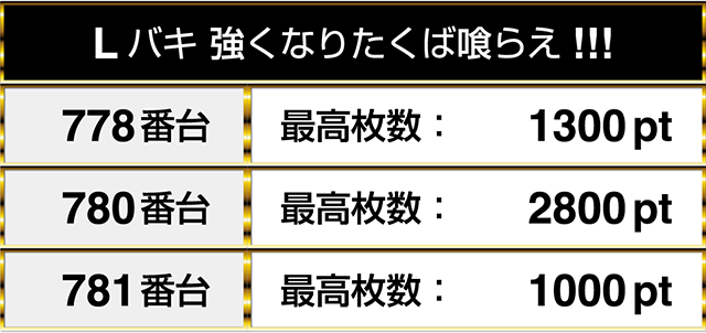 『Lバキ 強くなりたくば喰らえ!!!』も3台すべてがプラスptを記録し、どの台も1000pt以上であった。