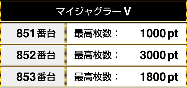 最終的には『マイジャグラーV』の3台が並んで1000pt以上を記録し、そのうちの1台は3000pt!