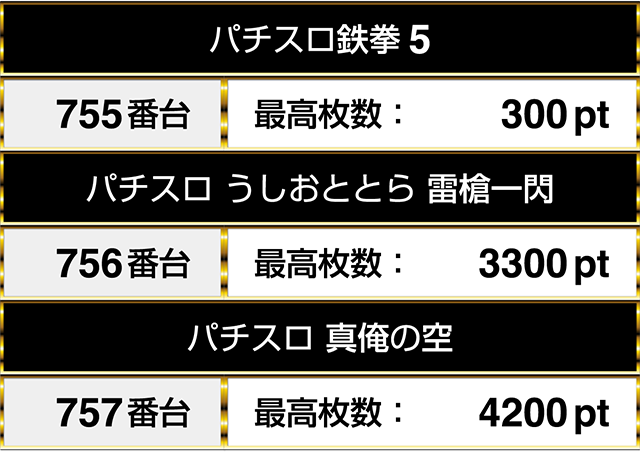 閉店時にプラスptが3台以上並んだ場所のなかには、すべて1000ptを上回る機種もあった。