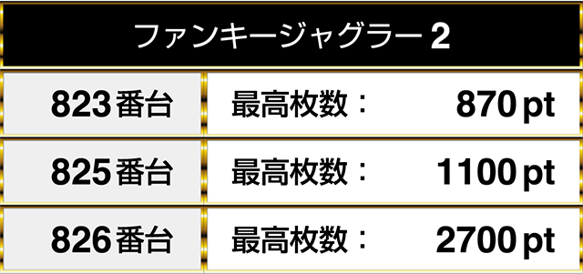 最終的には『ファンキージャグラー2』の3台が並んでプラスptを記録し、1台は2700pt!!