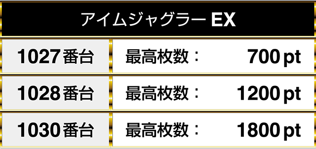 『沖ドキ!GOLD』の1010番台から1012番台までに7600pt、1500pt、2200ptが並ぶ!!