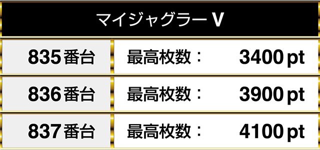 最終的には『マイジャグラーV』の835番台から837番台までに3400pt、3900pt、4100ptが並ぶ!!
