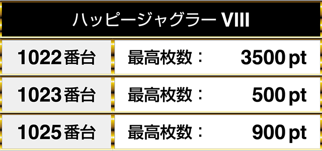 『ハッピージャグラーVIII』も3台が連なってプラスptを記録し、1台は3500ptとなった。