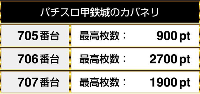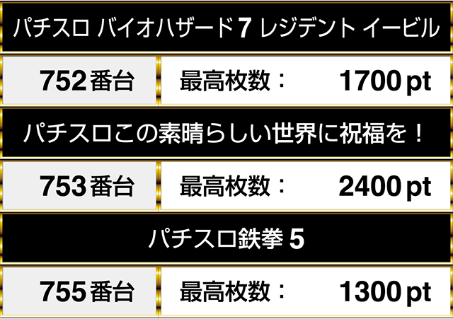 どの台も1000pt以上であり、753番台の『パチスロこの素晴らしい世界に祝福を!』は2400ptでこの日を終えた。