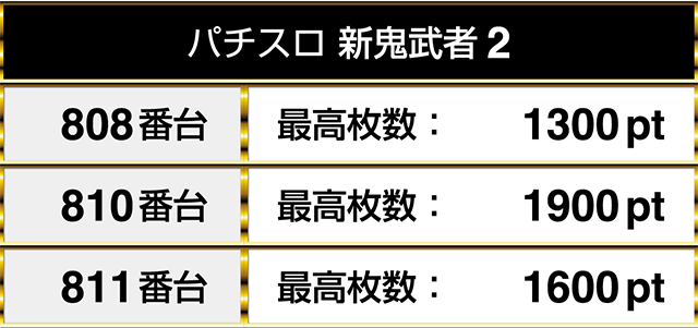 『パチスロ 新鬼武者2』も3台が並んでプラスptを記録し、どの台も1000ptを上回った。