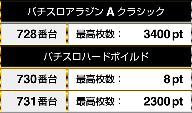 バラエティコーナーでは、『パチスロアラジンAクラシック』の728番台が3400pt!