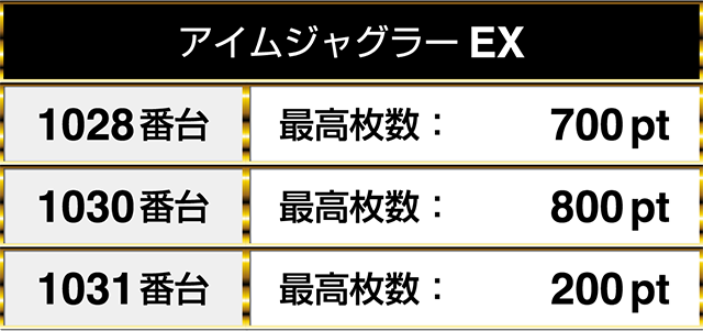 『アイムジャグラーEX』の1028番台から1031番台までが並んでプラスpt!