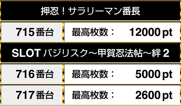 となりにある『SLOTバジリスク~甲賀忍法帖~絆2』の2台をあわせると、3台が並んでプラスptを記録!!