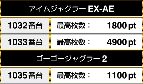 『アイムジャグラーEX-AE』と『ゴーゴージャグラー2』も3台並びでプラスptを記録し、1台は4900ptであった。