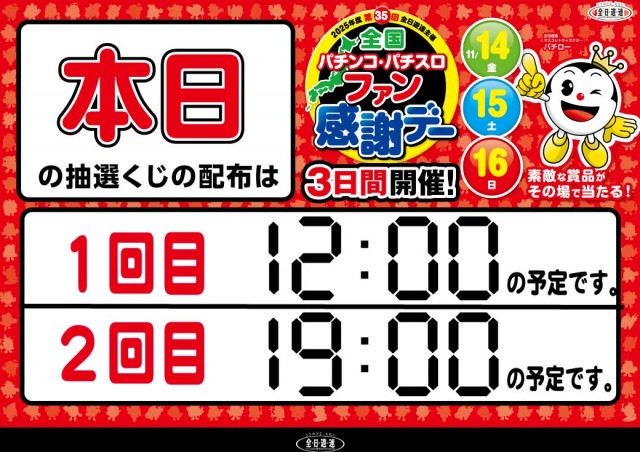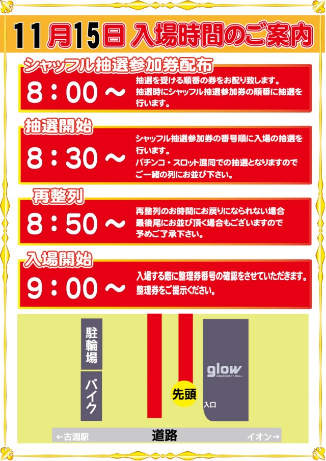 8時00分よりシャッフル抽選券配布、8時30分より入場整理券のシャッフル抽選を行います。 |