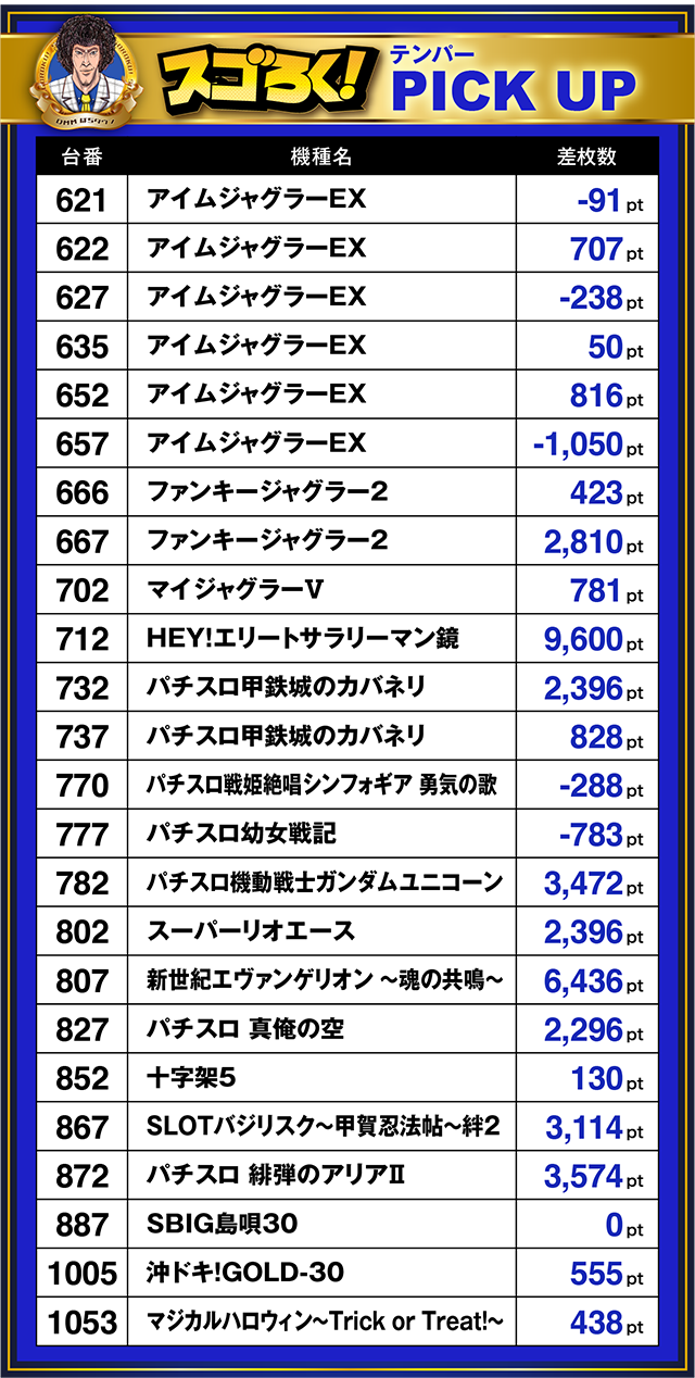 667番台の「ファンキージャグラー2」が2,800pt以上と好記録をマークしていたぞ。