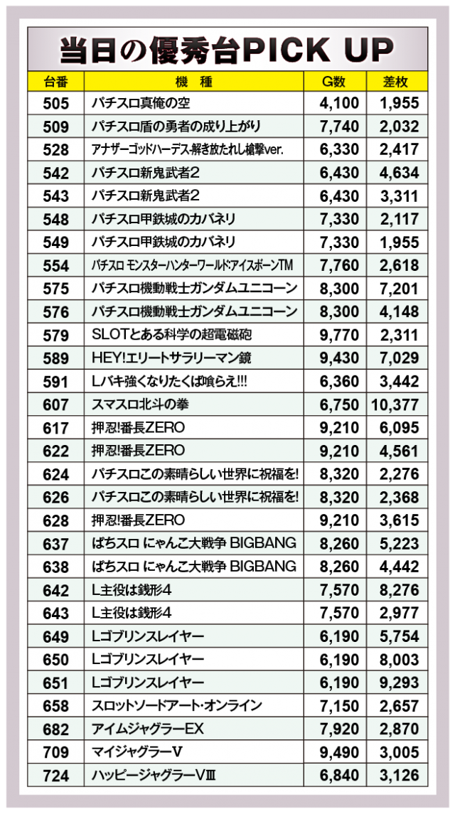 まずは優秀30台のPICK UPから。30台のうち28台が差枚数+2千枚以上を達成、+3千枚オーバーは18台、+4千枚オーバーは13台となった。後述する好調3機種以外では、607番台の『スマスロ北斗の拳』で+10,377枚を獲得し、この日のトップ差枚数をマークした。次いで、575番台の『パチスロ機動戦士ガンダムユニコーン』で+7,201枚、さらに589番台の『HEY!エリートサラリーマン鏡』で+7,029枚が光っていた。
