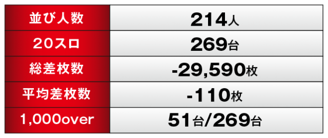 今回の総差枚数は-29,590枚で、残念ながら前回のリベンジとはならず、悔しい結果となってしまった。しかし、上述した通り各所でドル箱に手を伸ばす光景が目につき、大勢のファンが楽しんだ一日であったのは間違いない。次の機会には必ずリベンジを果たしてくれることを期待して、ファン諸氏は今後も同店の動向や情報を随一チェックしておくことをオススメするぞ!