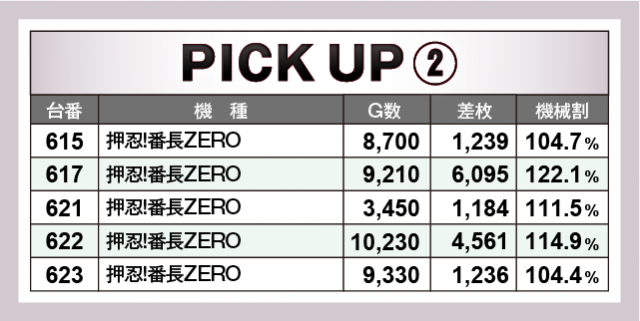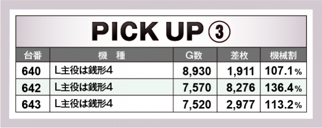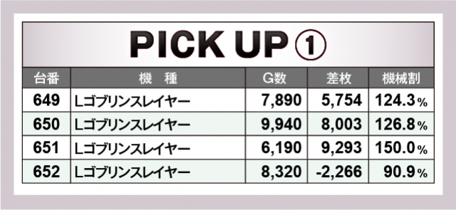 続いては当日好調だった3機種をチェック。まず『Lゴブリンスレイヤー』では、651番台の+9,293枚・650番台の+8,003枚を中心に、全4台中3台がプラス差枚をマーク。次いで『押忍!番長ZERO』では、617番台の+6,095枚を筆頭にピックアップ5台のトータル差枚数は+1万4千枚オーバーとなり、島全体が熱気に満ちていた。そして、『L主役は銭形4』でも、642番台の+8千枚オーバーという大きな数字を確認できた。どの機種もしっかりとゲーム数が回されており、朝から晩までじっくり打ち込まれていた様子が窺える。