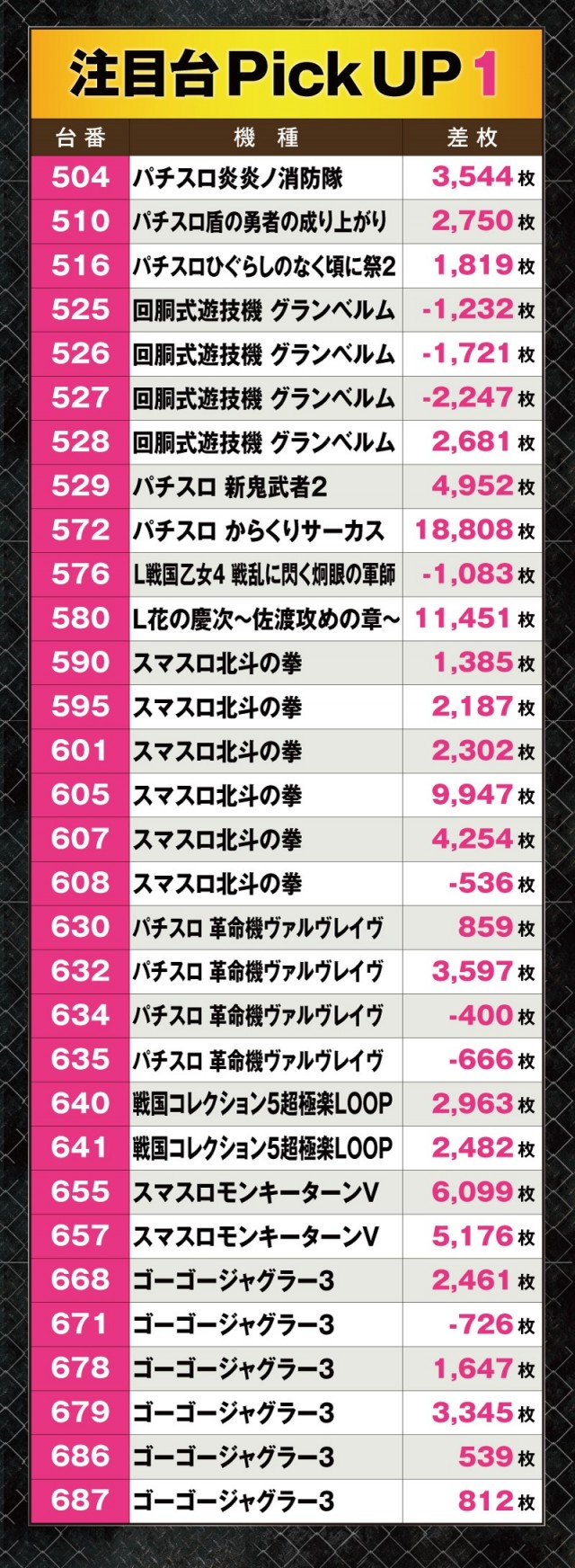 今回店内状況で特に目に付いたのはスマスロ。『パチスロ からくりサーカス』では+18,808枚、『L花の慶次~佐渡攻めの章〜』は+11,451枚と、見事なパフォーマンスを披露している!さらに『スマスロ北斗の拳』も万枚一歩手前の活躍だった。