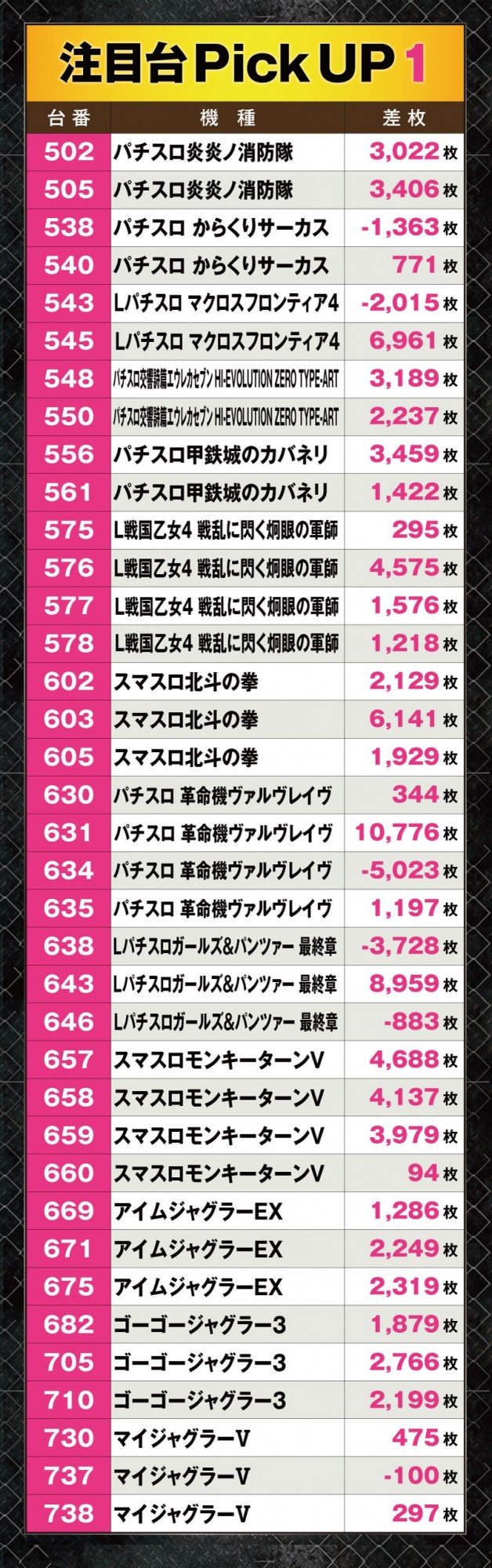 さらに『Lパチスロガールズ&パンツァー 最終章』は+8,000枚、『Lパチスロ マクロスフロンティア4』や『スマスロ北斗の拳』では+6,000枚、『スマスロモンキーターンV』においては4台平均+3,255枚と、多数の機種がスマスロのポテンシャルを最大限に発揮できていた。