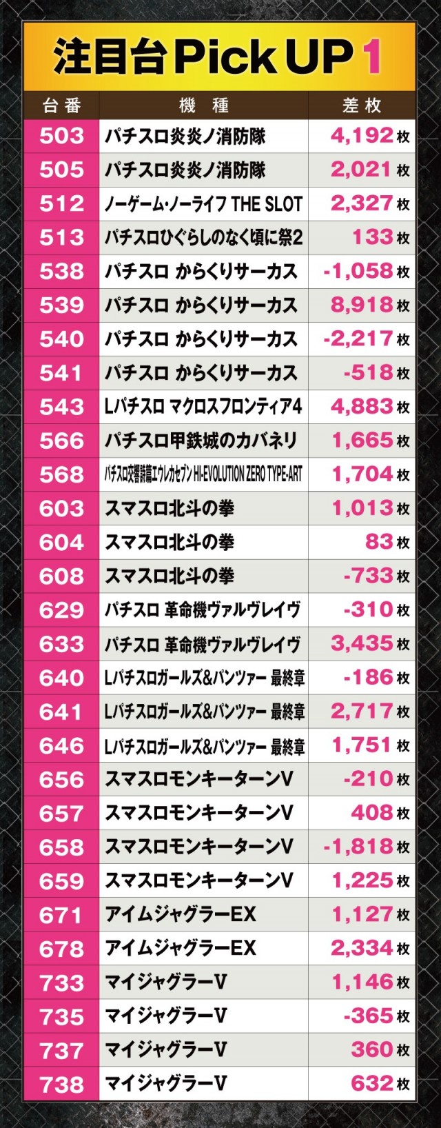 全台系では『パチスロ からくりサーカス』の4台が対象となっており、なかには+8,918枚と素晴らしい結果を残している。