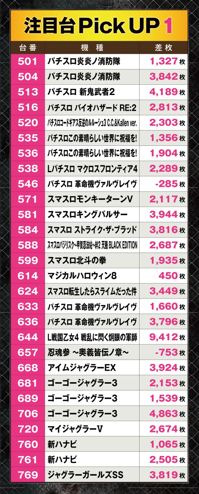 さらにジャグラーシリーズの注目度も高く、『ゴーゴージャグラー3』+4,863枚、『アイムジャグラーEX』+3,924枚、『ジャグラーガールズSS』+3,819枚と、各機種ポテンシャルを最大限に発揮できていた。